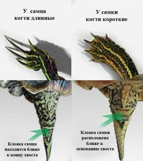 Этот способ не надёжно помогает узнать пол, т. к. у молодых пресмыкающегося когти не до конца сформированы, а зрелое животное стачивает маникюр об жёсткий грунт.