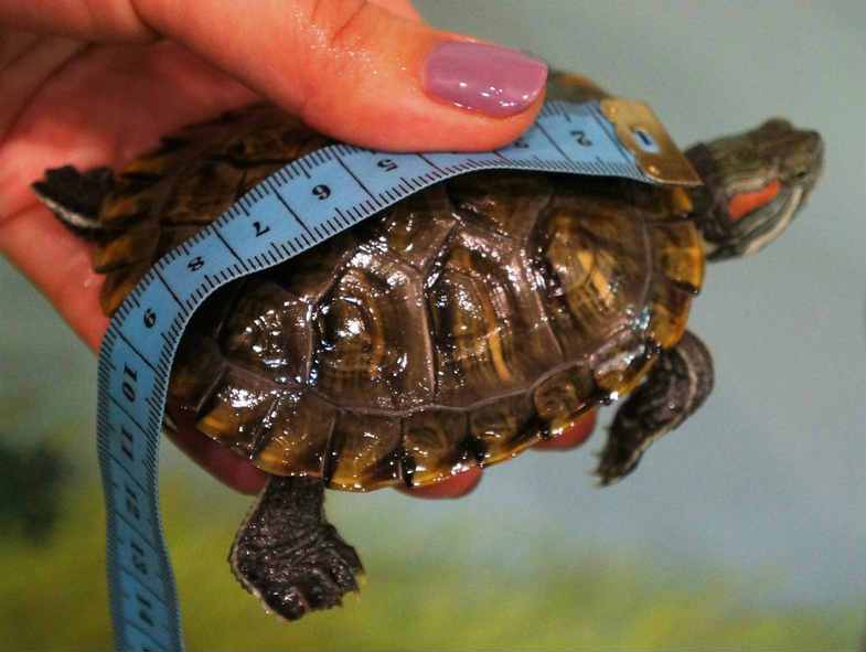 Метод 3. Размер панциря. Красноухие черепахи продолжают расти до 6 лет, после чего рост замедляется. В первый год жизни длина тела составляет 6-7 см, а затем рост происходит следующим образом: