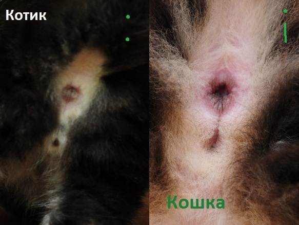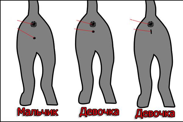 У самцов, даже кастрированных, оно большое (значительно больше сантиметра), в то время как у кошечек же анальное отверстие и половая щель располагаются очень близко друг к другу.