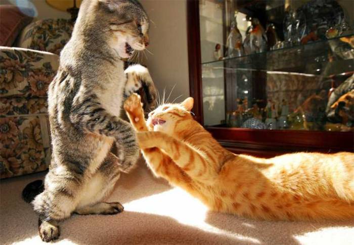 Во-первых, каждая схватка – вопрос статуса. Оказываться на последних позициях в иерархии себе дороже. Во-вторых, исход столкновения напрямую отразится на будущей территории проживания кота. В кошачьих боях ставки всегда высоки, и не имеет никакого значения, борьба ли это за участок леса для охоты или за уютный уголок у печки. Территориальная агрессия может проявляться и по отношению к бездомному коту, с которым ваш питомец ведет напряженную игру в «гляделки».