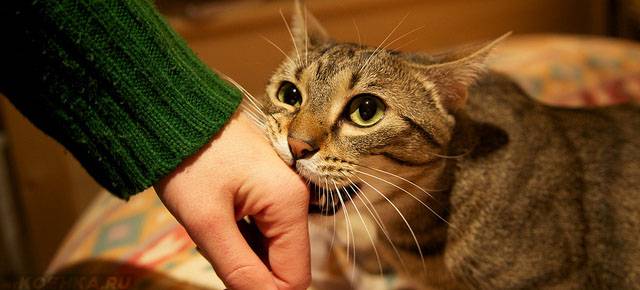 Если кошка все же укусила вас, нельзя резко отдергивать руку. Так поступает добыча – дергается и пытается убежать. Лучше всего не двигаться или даже приблизить укушенную руку в сторону кошки. Она в недоумении отпустит вас.