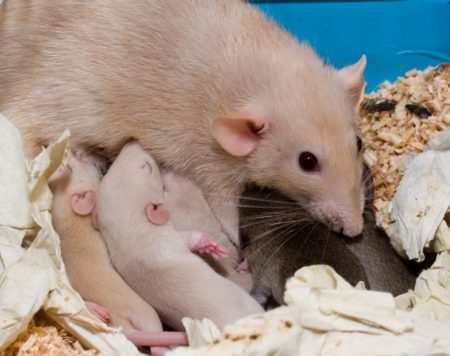 В преддверии родов самка ищет уединение, прекращает прием пищи и начинает строить гнездо. Важно разместить клетку в теплом и спокойном месте. Также необходимо обеспечить достаточное количество воды, так как во время родов крыса теряет много жидкости.