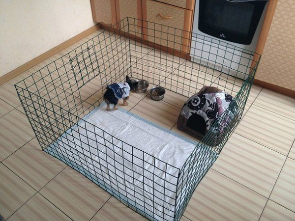 - Если у вас ограничено время на приучение, постарайтесь ограничить пространство щенка. Сразу после еды или сна – в это время собаки обычно писают, сажайте его в загороженное место. Пусть он остается там, пока не справит нужду, а затем можно выпустить погулять. Если щенок постоянно находится в загоне, он должен включать игрушки, лежанку, туалет и немного свободного чистого пространства.