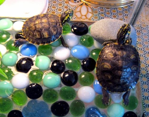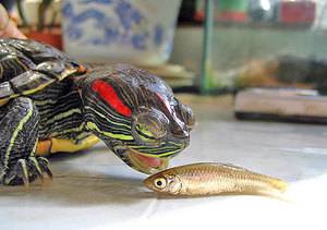 - черепашья молодь, по сути, являются хищниками, и в основном особи питаются рыбой – опытные заводчики рекомендуют запускать в резервуар живых рыбок, которых рептилии могут поедать;