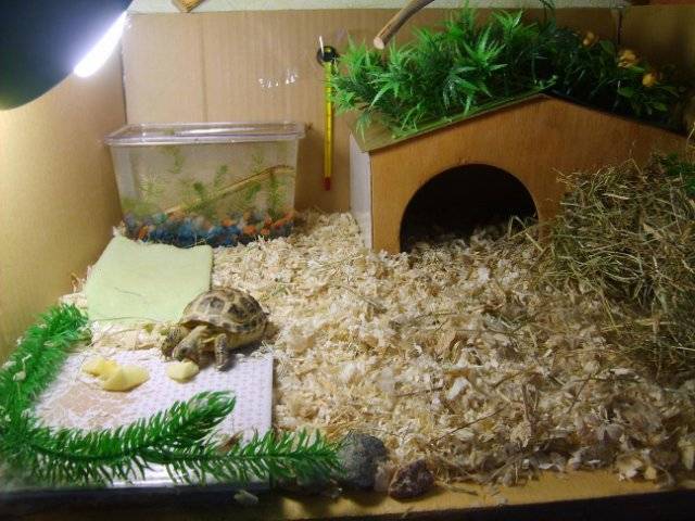 В аквариуме должна стоять поилка с чистой, отстоянной водой. Чтобы поддерживать комфортную температуру воды поилку устанавливают под лампой. Черепахе требуется укрытие. Для этого приобретают или самостоятельно делают небольшой домик и устанавливают его в тень.
