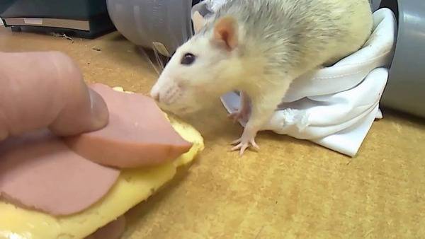 - Через некоторое время предложите питомцу то же лакомство, но уже из своих рук. Если крыса начнёт есть, значит, обучение прошло успешно.