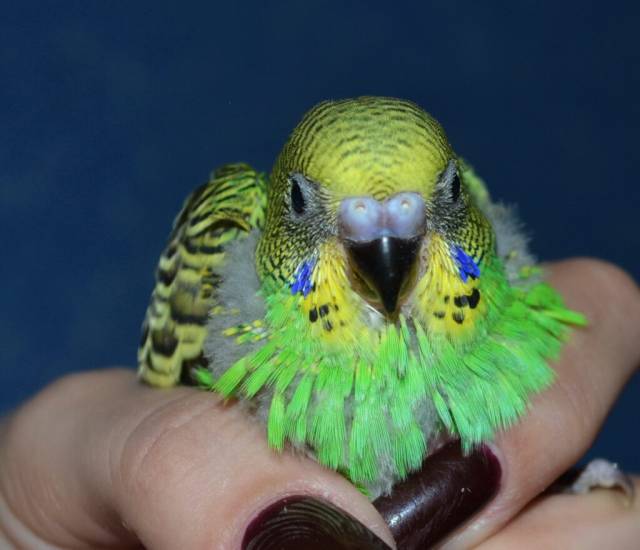 - Пятнышки на горле. О том, насколько взрослым является попугай, свидетельствует форма пятен. У птичек первого года жизни, пятнышки отмечаются неправильной формы и бледноватого цвета. Со второго года они начинают выравниваться, и с годами становятся совсем ровными, приобретая яркий синий или фиолетовый окрас.
