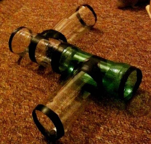 Перед тем как соединить две бутылки в форме буквы «Т», вам предстоит выполнить несколько шагов. С помощью обычного ножа сделайте надрез в виде «+» на стенке одной из бутылок. Аккуратно удалите пластиковую заднюю часть, стараясь не повредить ее, иначе бутылка станет непригодной. Затем, используя тот же метод, что и ранее, обклейте весь край только что вырезанного отверстия полосками изоленты шириной 1 см.