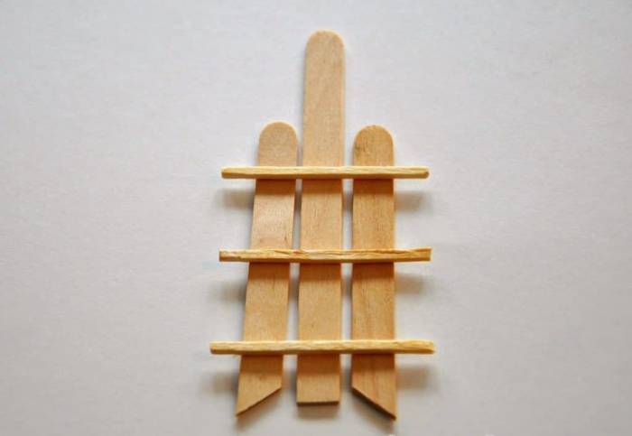 Две загнутые палочки соединяются концами, образуя полукруг. Место соединения снизу фиксируется с помощью третьей палочки. Аналогичные действия выполняются с тремя другими загнутыми палочками, в результате чего получаются две арки – опоры для будущего моста. Оставшиеся прямые палочки приклеиваются параллельно к арочным основам, образуя перекладины мостика.