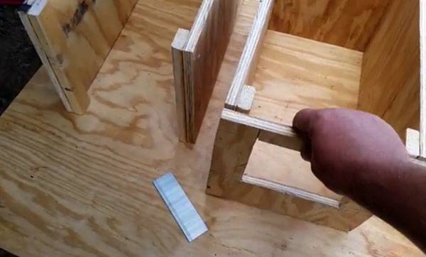 Сборку конструкции следует начинать со стенок. Для этого необходимо взять одну фанерную заготовку и прикрепить к ее краям рейки с помощью гвоздей. Получившуюся рамку нужно заполнить утеплителем, например, древесными опилками, и накрыть сверху фанерой. Аналогичным образом следует изготовить еще четыре таких двойных утепленных стенки для домика.