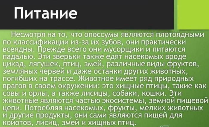 Еда опоссума должна еще состоять из белковых продуктов, а именно: