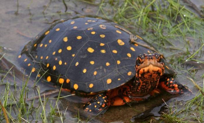 - Пятнистая. Это полуводный вид. Пятнистую черепаху легко узнать по желтым пятнам на шее, ногах, панцире и голове, в то время как остальные части тела черные. В конечном итоге они достигают длины 9-10 см. Оптимальные условия в неволе составляют примерно 50% воды и 50% суши с крупными камнями и ветками.