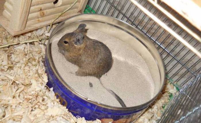 Купать дегу не нужно. Стоит отметить, что эти грызуны чрезвычайно чистоплотны и способны самостоятельно позаботиться о собственной гигиене. Для этого достаточно установить в их клетке небольшую емкость с песком. Эту своеобразную купальню меняют ежедневно.