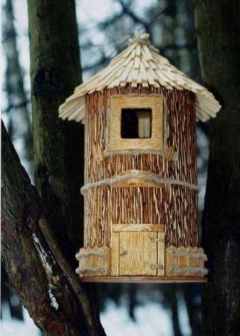 Если дом собирался из цельных бревен, то какую-либо часть можно оформить в технике декоративной резьбы по дереву. Сами же дощечки, ставшие стенками дома, предварительно удастся украсить выжженными картинками. Хорошим решением станет отдельно оформить входную зону – создать своеобразное крыльцо, напоминающее площадку скворечника, чтобы белкам оказалось проще попадать внутрь.