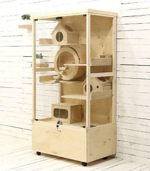Клетка-витрина отличается от проволочного вольера материалами, используемыми для создания фронтальных и боковых стенок. Их можно изготовить из стекла или акрилового стекла. В целом, такой дизайн напоминает большой аквариум, который можно рассматривать со всех сторон.