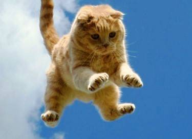 - Кошки, как опытные парашютисты, умеют контролировать скорость своего падения. В начале полета они инстинктивно вытягивают конечности, увеличивая скорость. Затем расслабляются и расправляют лапы в стороны, что увеличивает площадь тела и сопротивление воздуха, снижая тем самым скорость и силу удара.