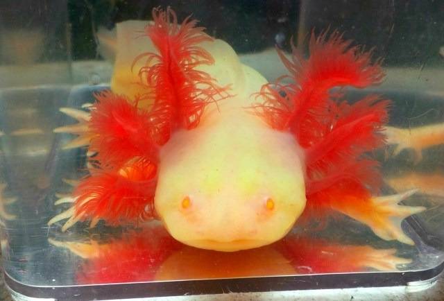 Среди аквариумистов особенно популярны альбиносы, которые бывают в двух основных цветах — белом и золотом. Белый альбинос отличается красными глазами, а золотой аксолотль напоминает его, но на теле у него располагаются золотистые пятна.