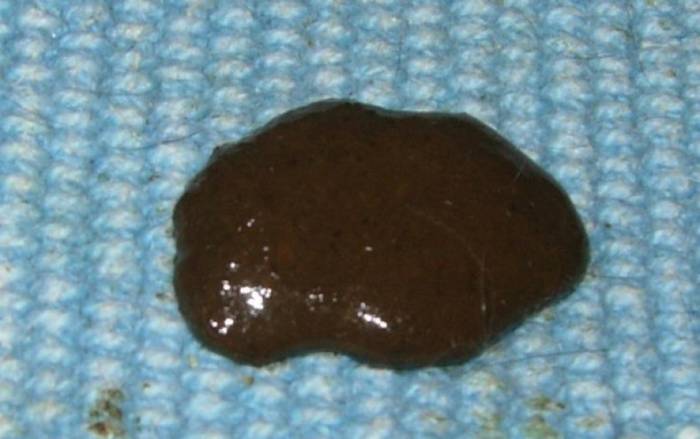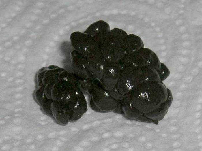 - черный цвет или цвет дегтя – употребление в пищу некоторых продуктов: смородины, аронии, вишни; прием препаратов с висмутом или железом, а также кровотечение в желудке или двенадцатиперстной кишке, цирроз печени;