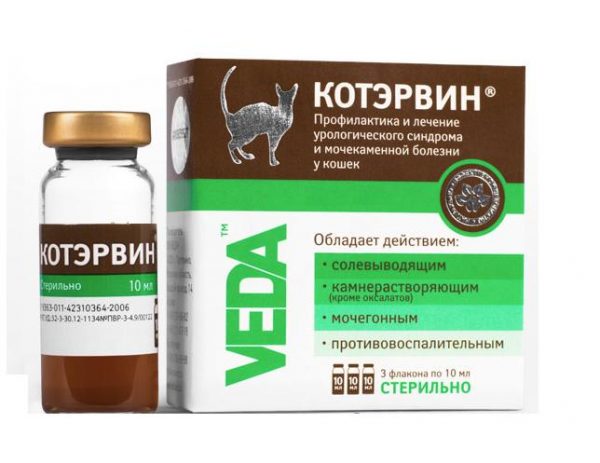 | КотЭрвин | Водный экстракт растительных компонентов | Обезболивающее, противовоспалительное, диуретическое, камневыводящее | Капли для приема внутрь | Аллергия на ингредиенты раствора | От 140 рублей за упаковку (3 флакона по 10 мл) |