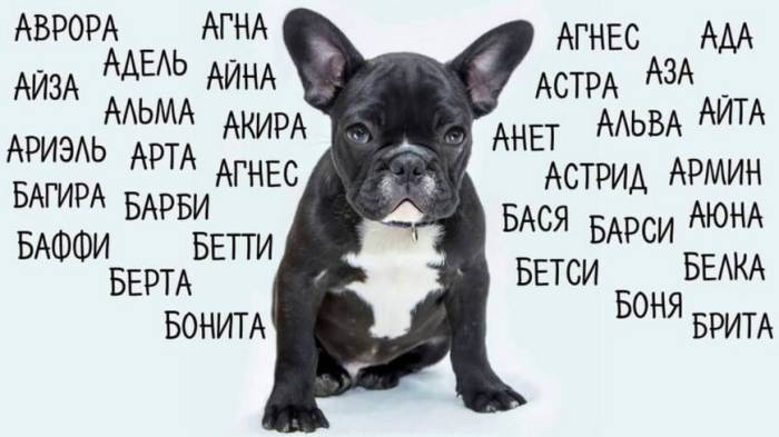 | Французский бульдог | Общительные, игривые, ласковые, упрямые, с чувством юмора | Буся, Долли, Ева, Жужа, Клео, Лилу, Моника, Нюша, Оливия, Плюша |