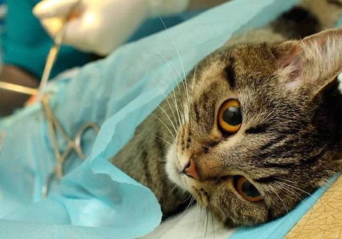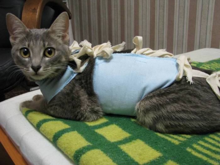 Необходимо быть внимательным, так как чрезмерное зализывание может негативно сказаться на качестве швов. Кормить кота разрешается только на следующий день после операции (в первый день к вечеру можно предложить лишь воду), поскольку некоторые препараты анестезии могут вызвать рвоту.