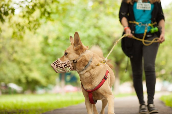Одновременно нужно начинать приучать щенка к ошейнику, поводку и наморднику, а также, при необходимости, к защитному комбинезону и ботинкам. Чаще намордник нужен не на случай агрессии, а для того, чтобы собака ничего не подбирала на улице и во время передвижения по городу.