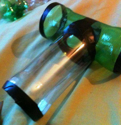 С помощью двух бутылок можно создать более сложную конструкцию. Обе емкости подготавливаются одинаково: отрезаем дно и горлышко. Края первой бутылки обматываем изолентой. В центре первой бутылки вырезаем отверстие, соответствующее диаметру второй. Для этого используем канцелярский нож. Сначала делаем крестообразный надрез, затем аккуратно отгибаем края, избегая чрезмерного натяжения, так как пластик может легко треснуть. Вставляем ножницы и вырезаем необходимое отверстие. Обрабатываем окружность изолентой. Чтобы обеспечить более плотное соединение, края бутылки, которую будем вставлять, сплющиваем и обрезаем верхний и нижний края по диагонали. Обматываем край изолентой. Вставляем вторую бутылку в первую. Если края плотно прилегают друг к другу, фиксируем обе бутылки изолентой.