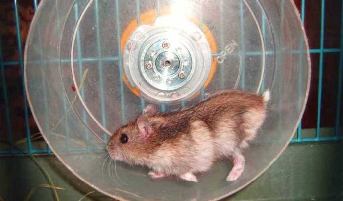 Железное колесо из мелкой сетки – не очень хороший выбор, потому что оно может травмировать подушечки лап хомяка и вызвать пододерматит.