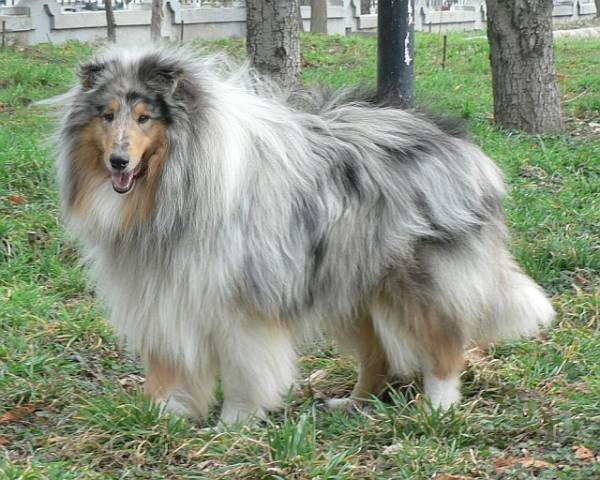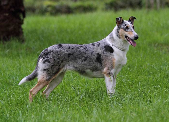 - Мраморный или блю-мерль. Собаки с мраморным окрасом выведены сравнительно недавно и довольно редки. На преобладающем серебристо-голубом фоне видны черные отметины, пятна, прожилки, создающие эффектный мраморный рисунок. Приветствуются рыжие подпалины на конечностях и голове, но при их отсутствии собака не выбраковывается. Более строго судьи относятся к наличию бурого, грязно-серого оттенка остевых волос и подшерстка.