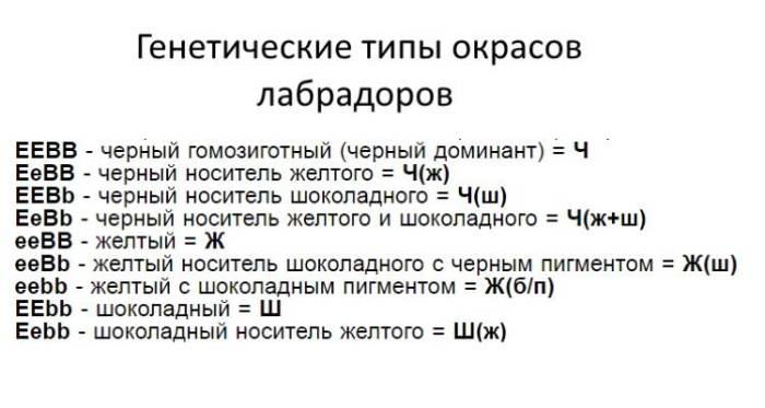 В генетике буквами В и E обозначают черный цвет шерсти. Эти гены оба доминантные. Шоколадный и палевый окрас обозначены буквами b и e, и это рецессивные гены. Всего существует 9 разных комбинаций генов. Щенку передается пара генов от каждого родителя.