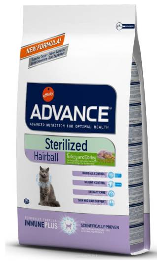 Имеется в ассортименте и специальный корм для кошек, которые переживают линьку — Advance Cat Hairball. Благодаря содержащимся в нем растительным волокнам в большом количестве шерсть гораздо лучше выводится из желудка.