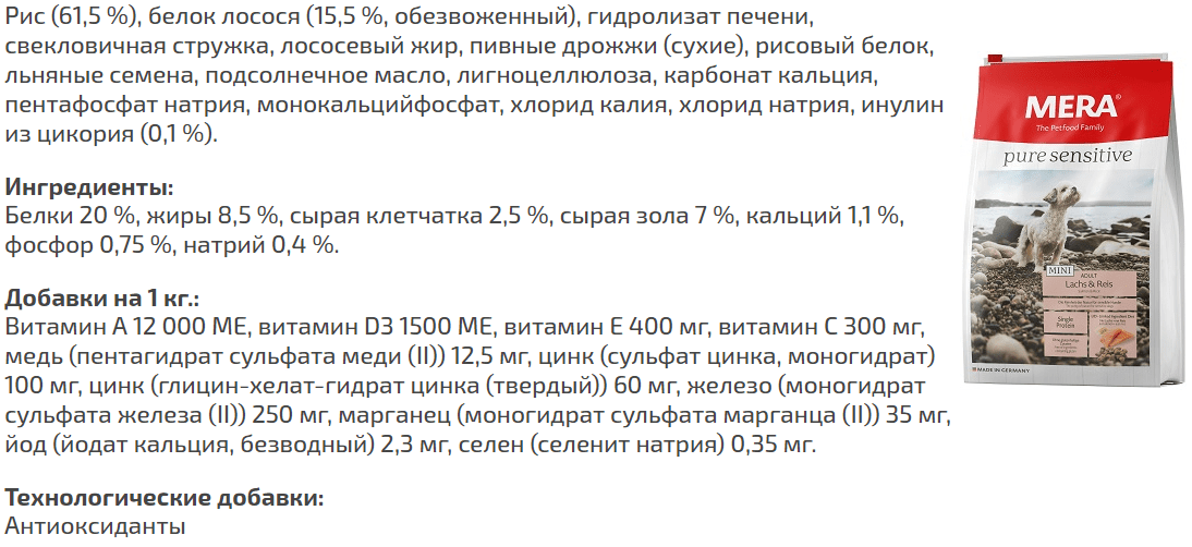 Пример состава корма Mera Pure Sensitive mini adult lachs&reis (для взрослых собак малых пород с лососем и рисом)