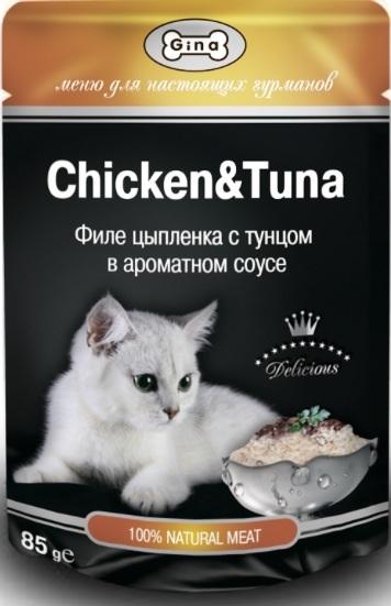 Упаковка выделяется оригинальным дизайном, который намекает на премиальность продукта. В составе на первом месте находятся тунец (43,5%) и рыбный паштет (11,4%). Жидкость состоит из бульона и желатина.