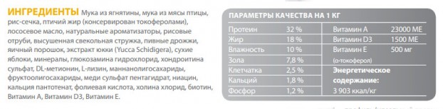 Именно первые три компонента составляют основу корма, а поскольку на первых местах мясные ингредиенты — можно быть уверенным, что указанные 32% протеинов — животного происхождения, а не из какой-нибудь кукурузы (как в случае дешевых кормов эконом класса). Пройдясь далее по составу видим ингредиенты, отвечающие за наличие в корме витаминов, минералов и других полезных веществ.