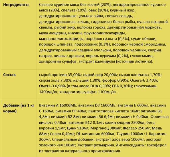 О высоком качестве питания свидетельствует указание содержания в процентах первых четырех компонентов. Первые позиции занимает курятина свежая и предварительно обезвоженная. Спельта (полба) – это полудикая пшеница – диетическое питание людей, которое очищает печень от холестерина и препятствует чрезмерному набору живой массы. Овес (плющеный, голозерный) набухает и очищает кишечник от шлаков и токсинов.
