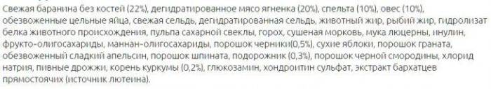 В этом корме ошибочно указали первый и основной компонент, который на русском языке описан как свежая баранина без костей. На самом деле название компонента звучит как «свежий ягненок травяного откорма» — значит, в корме не только филе, но и фрагменты подкожно-жировой клетчатки, мелких косточек, хрящей, возможно, некоторые субпродукты. А вот второй компонент — это действительно дегидрированное мясо ягненка.