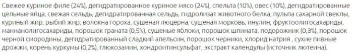 Корм с рыбным наполнителем основан на сельди, как свежей, так и сушеной, и перевод выполнен корректно. Удивительно, что гидролизат сельди, присутствующий в составе, отсутствует в английской версии. Все остальные ингредиенты уже были проанализированы в составах предыдущих кормов, поэтому продолжаем.