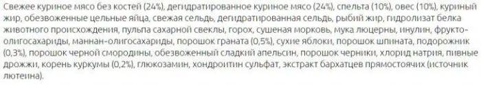 Основной компонент продукции — смесь из животных белков. Кроме того, в основе питания лежат значительные объемы рыбьего и куриного жиров. За счет этих ингредиентов в организм животного проникают полезные органические соединения омега-3 и омега-6.