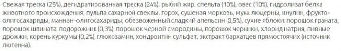 В составе этого корма на первом месте находится свежая треска, выловленная в дикой природе, а также добавлена треска в обезвоженном виде, что является правильным решением. Все остальные ингредиенты уже были проанализированы нами в рамках предыдущих обзоров кормов.