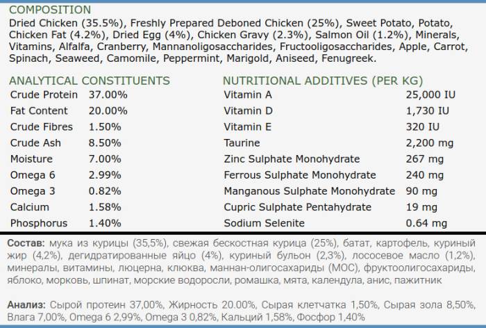 Состав: мука из мяса курицы (35,5%), свежее бескостное филе цыпленка (25%), батат, картофель, куриный жир (4,2%), дегидратированное яйцо (4%), куриный бульон (2,3%), лососевое масло (1,2%), минералы, витамины, люцерна, клюква, маннан-олигосахариды (МОС), фруктоолигосахариды, яблоко, морковь, шпинат, морские водоросли.