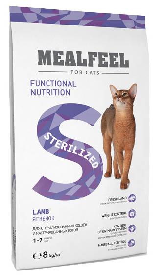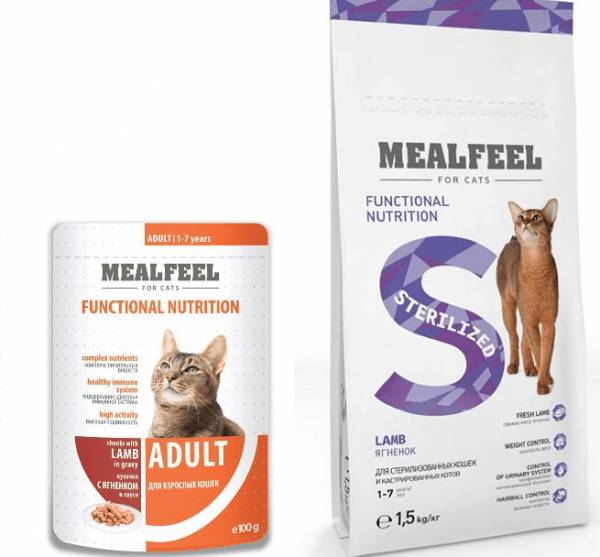 - Mealfeel Cat Sterilized Lamb (фасовка 0,4 кг и 1,5 кг) — для стерилизованных котов с ягнятиной;