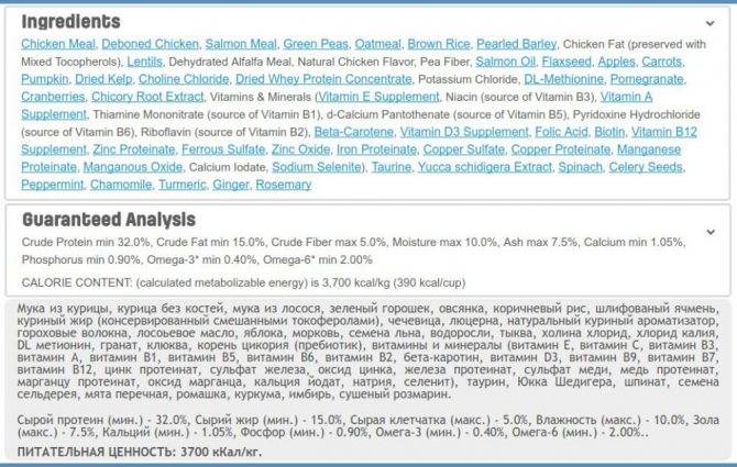 В составе на первом месте находится куриная мука, а не свежее мясо, хотя последнее также присутствует, но в меньших количествах по сравнению с зерновыми. Корм содержит множество растительных добавок и овощей, что для супер-премиум класса является довольно хорошим показателем.