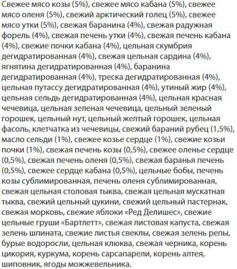 Свежее и быстро замороженное мясо цыплёнка и индейки составляет две трети от общего количества мяса в этом продукте, а одна треть — это мясо, высушенное при температуре 90 °C. Для повышения питательной ценности добавлены рыба, куриные яйца, мышечное мясо, внутренности, хрящи и сублимированная печень.