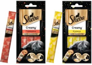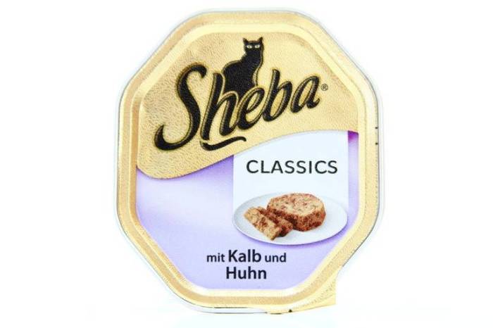 Sheba Delicatesso («Деликатес»): доступен в формате паштета с кусочками и фрикасе. Варианты включают: курицу с телятиной, мясо птицы, лосось, индейку в соусе «Бешамель», утку с кроликом и овощами, а также говядину. Упаковка выполнена в виде полимерных баночек с фольгированными крышками. Состав: кролик (не менее 4%), утка (не менее 4%), субпродукты и мясо, овощи, злаки, минеральные вещества и витамины. Содержание белка — 8,5%, жиров — 5,5 г, клетчатки — 0,3%.