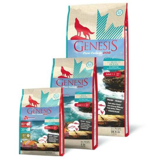 В нашем рейтинге кормов первое место занимает канадская марка Genesis Pure, которая считается одной из лучших в премиум-сегменте. В составе их сухих кормов содержится 80% мясных ингредиентов, при этом отсутствуют зерновые и злаковые компоненты.