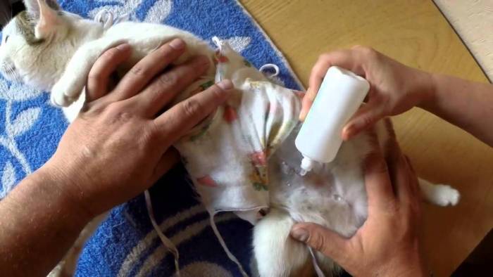 Каждый день необходимо правильно обрабатывать послеоперационный шов. Ветеринар подскажет, каким средством и как долго это делать. Процедура будет более комфортной для животного, если кошка стоит на задних лапах, а не лежит на спине.