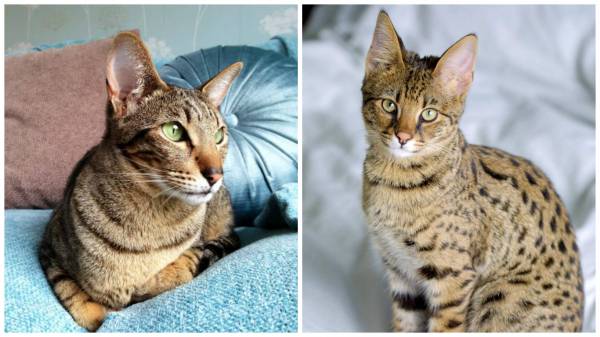 | Саванна | Очень большие, высоко посаженные, с закругленными кончиками | Крупное, стройное тело, пятнистый окрас, длинные лапы |