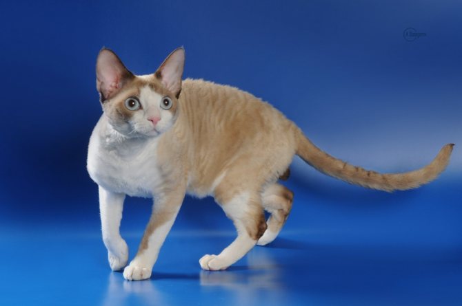 | Корниш-рекс | Большие, высоко посаженные, широкие у основания, с закругленными кончиками | Кудрявая шерсть, стройное тело, длинные лапы |