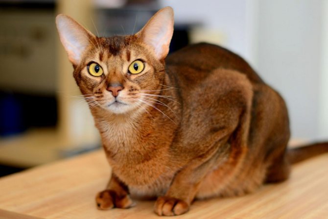 | Абиссинская кошка | Большие, широкие у основания, слегка закругленные на концах | Грациозное тело, тикированный окрас шерсти, выразительные глаза |