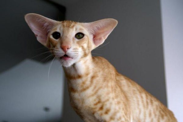 Особого внимания заслуживают уши ориентала. В стандарте породы четко отмечены черты, которые должны присутствовать в локаторах породистой котейки. Уши должны быть заостренные, треугольные, а своей линией продолжают линию скул.